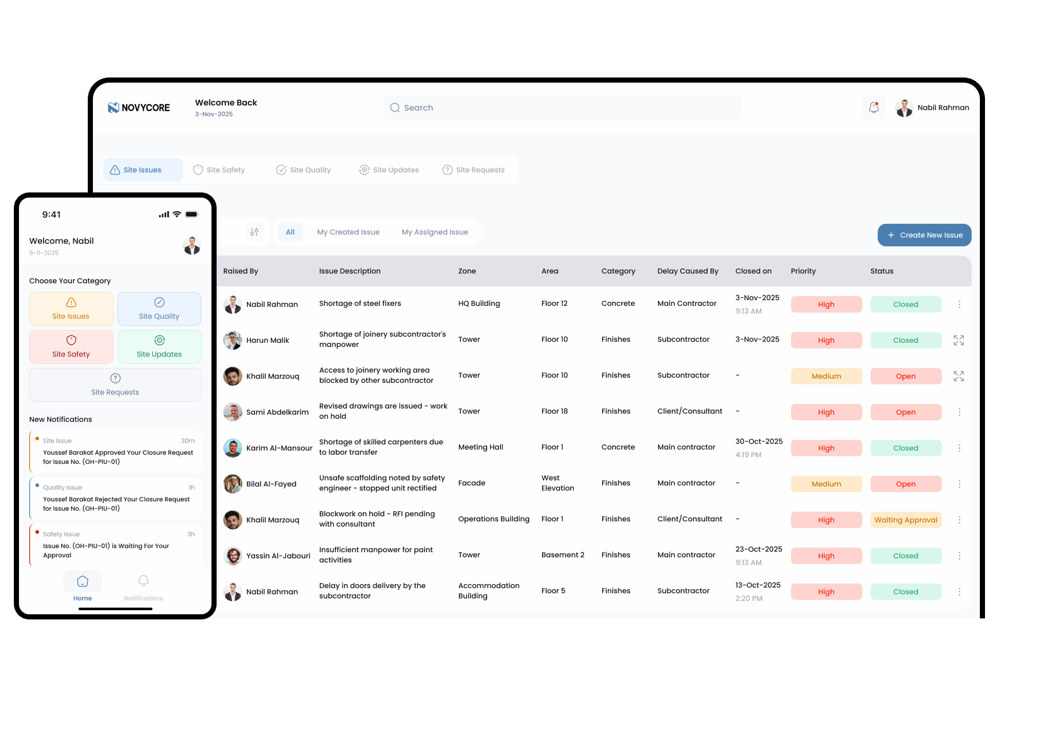 Novycore digitizes site workflows like updates, requests, observations, inspections, and analytics, enabling teams to work from a single source with real-time visibility.