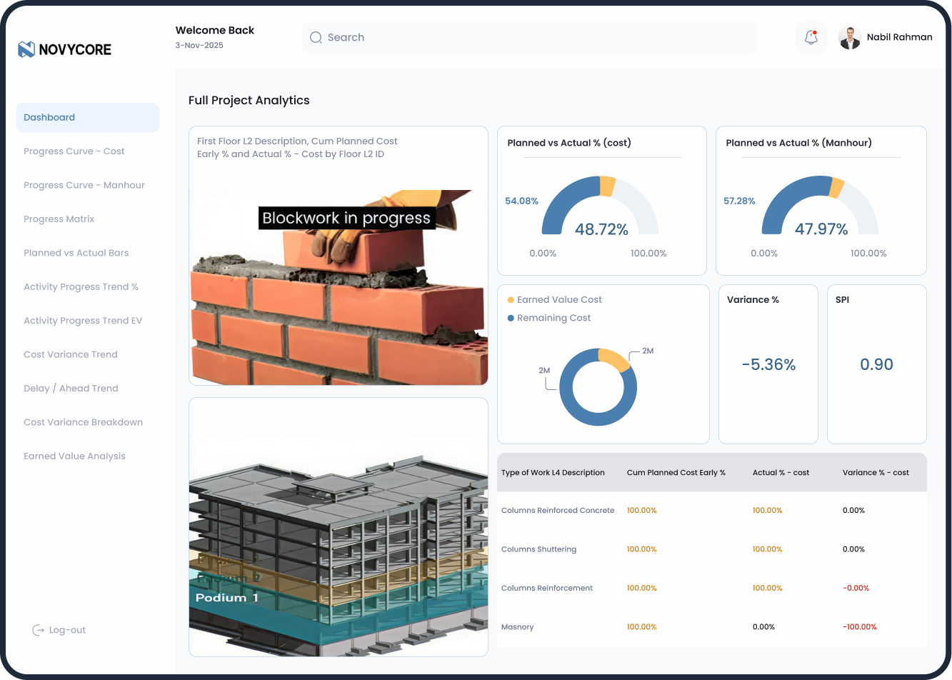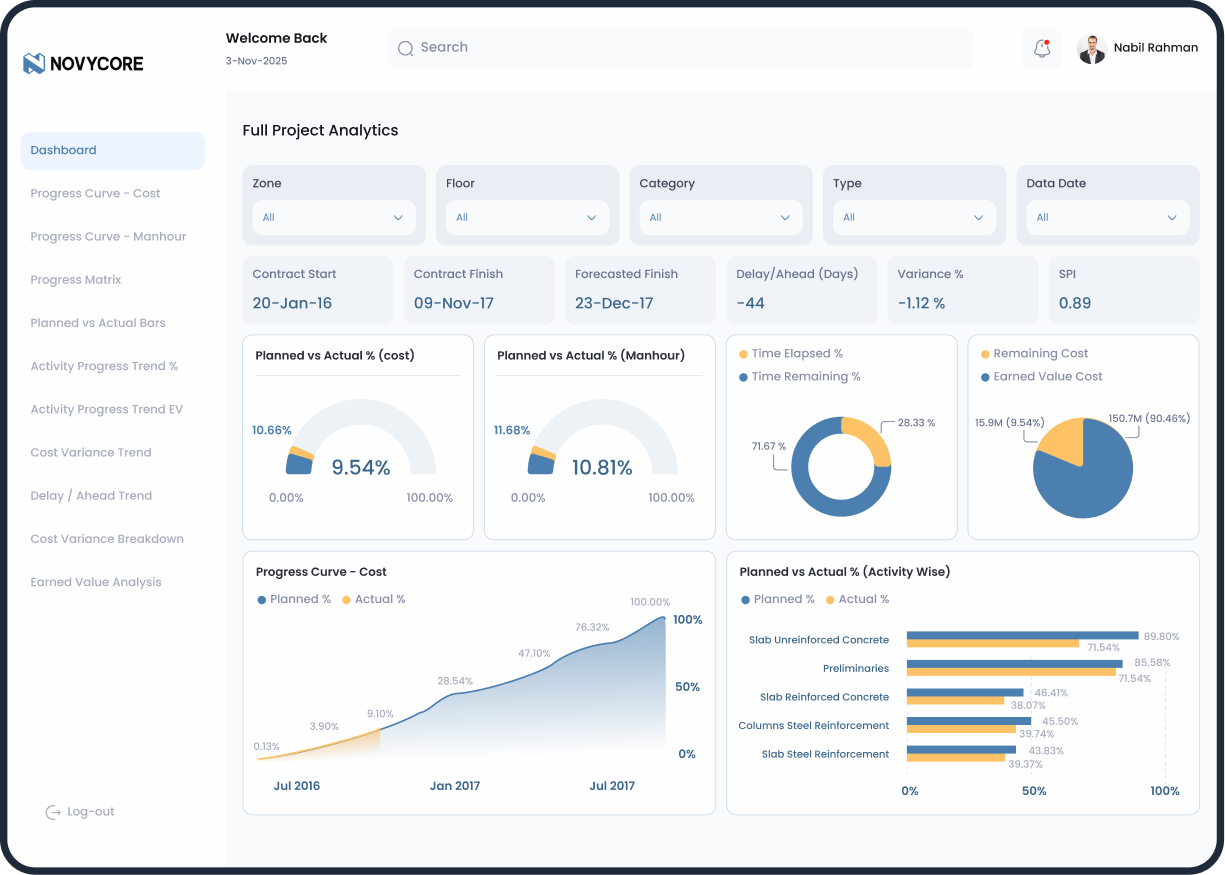 Site Analytics brings all planning, progress, and site data into intelligent dashboard views. Instead of chasing files and recalculating reports, teams gain instant insight to prepare reports, analyze progress and support decisions.