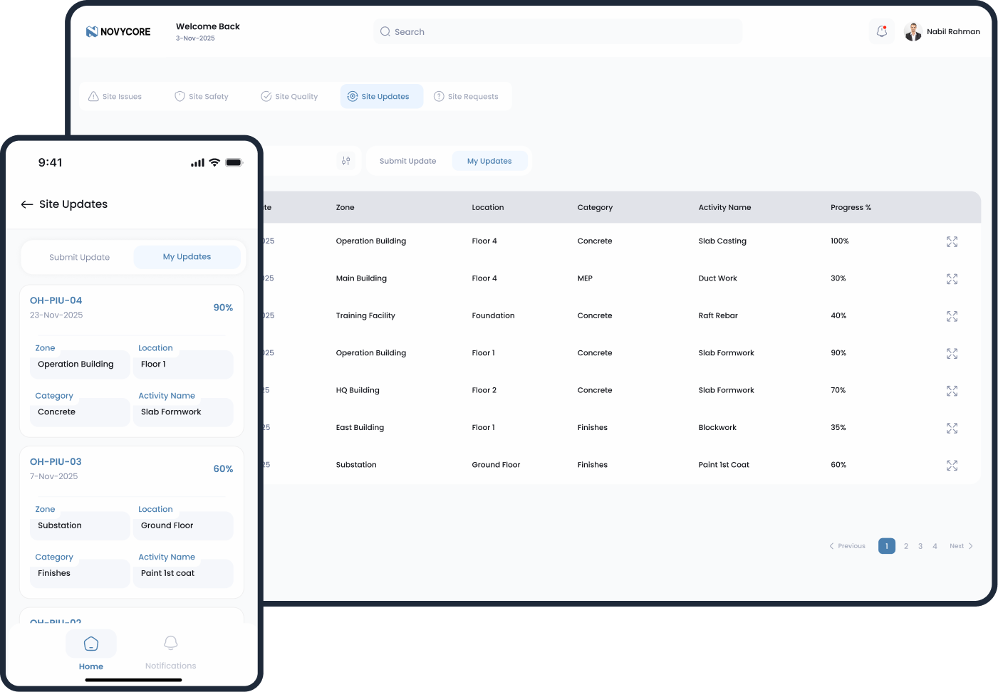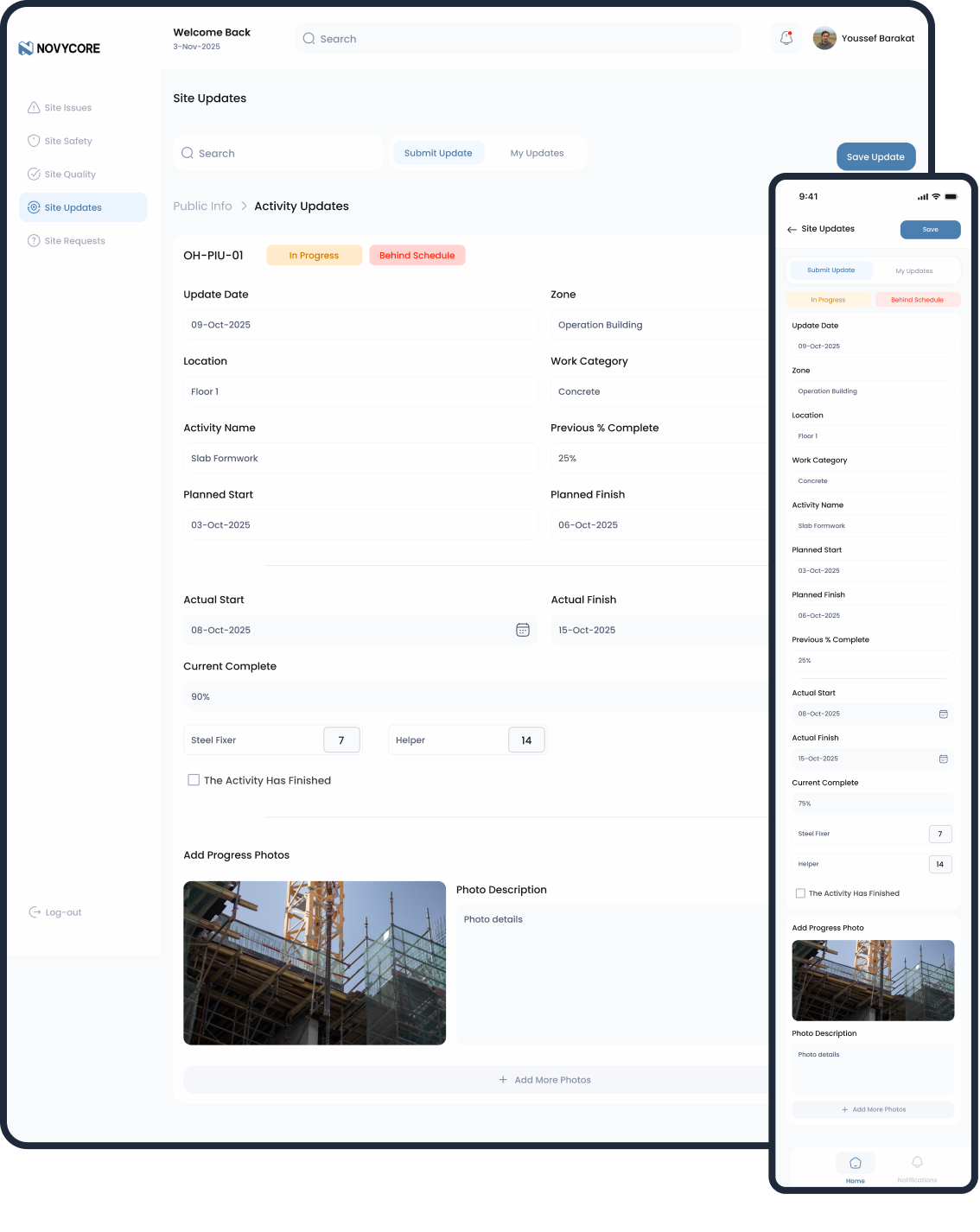 Site Update ensures progress is recorded consistently at the source — the site. The result is faster reporting, smoother schedule updates, better communication and reliable historical data you can trust for productivity tracking and delay analysis.